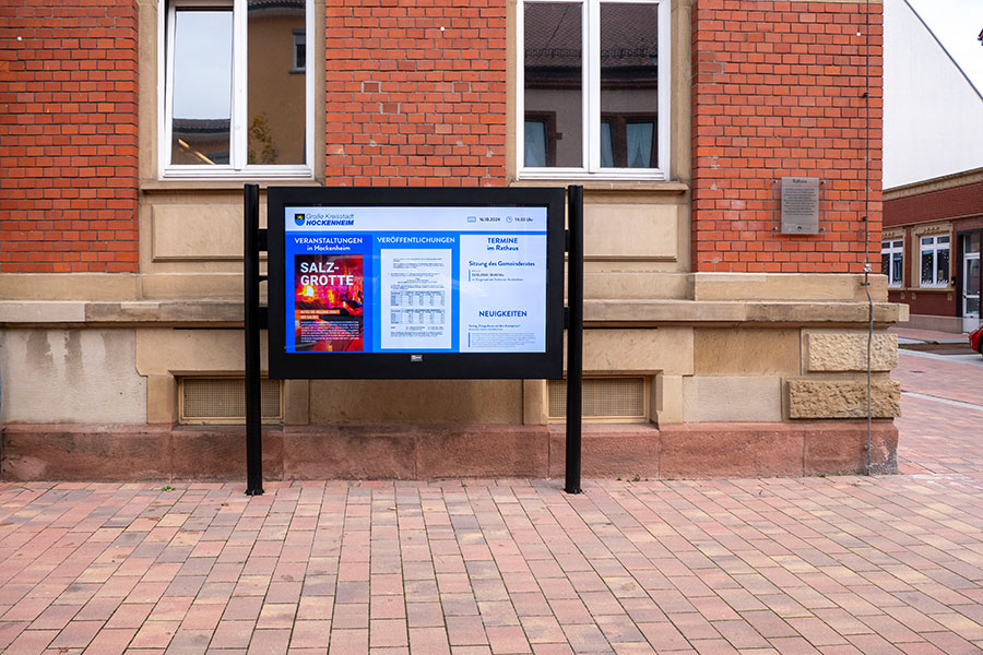 Ob Bekanntmachungen, Veranstaltungsinfos oder Hinweise auf Bürgerdienste – die kommunalen Inhalte werden über digitale Displays im Innen- und Außenbereich zentral gesteuert und tagesaktuell ausgespielt. In Ulm wurden im Dienstleistungszentrum der städtischen Bürgerdienste großformatige Bildschirme zur Orientierung und Wartemarkenanzeige installiert. Die Inhalte sollen über Abläufe, Ansprechpersonen und aktuelle Themen informieren. Schönau im Schwarzwald hat ein digitales Infosystem direkt am Rathaus in Betrieb genommen. Die dort installierten Displays sollen Bürger und Gäste über aktuelle städtische Angebote, Veranstaltungshinweise, Termine und Verwaltungsthemen informieren. In Hockenheim läuft nun ein interaktives Stadtinformationssystem: Dazu gehören zwei 55-ZollOutdoor-Touchsteelen, ein 75-Zoll-Touchdisplay im Außenbereich des Rathauses, ein tageslichtgeeignetes Schaufensterdisplay mit Brandschutzeinhausung sowie zwei 32 Displays vor Sitzungssälen, die automatisch Raumbelegungen und Sitzungstermine anzeigen.